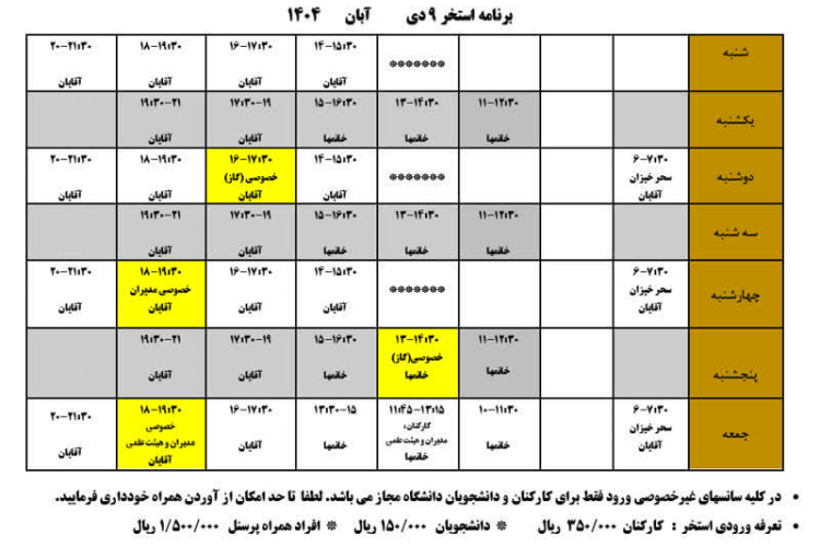 برنامه استخر ۹دی مهر ماه ۱۴۰۴