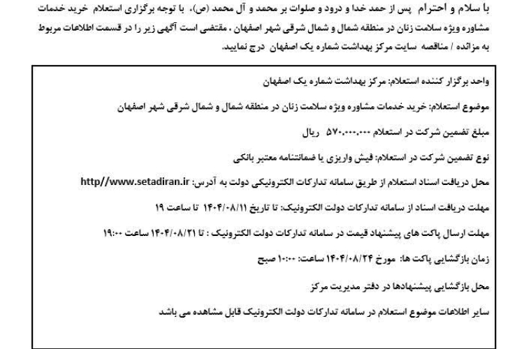 ✅آگهی خرید خدمات مشاوره ویژه سلامت زنان در منطقه شمال و شمال شرقی اصفهان