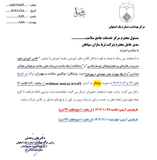 وبینار کلاس آموزشی نحوه مدیریت رفتارهای پرخطر نوجوانان توسط والدین و مداخلات ارتقاء سلامت در برنامه های سلامت نوجوانان،جوانان و مدارس و ارتقاءمهارت های اجتماعی در جوانان جهت پزشکان ،مراقبین سلامت و بهورزان